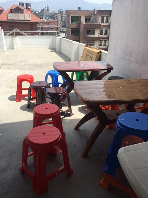 Though we are not fond of plastic furniture and we raise awareness about environment protection with the students, as the canteen corner is outside on the terrace, exposed to wind and monsoon rains, we picked solid and long lasting plastic tables and stools for that area.